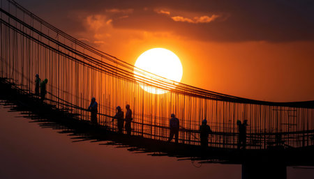 A group of people are walking across a bridge at sunset. The sun is setting in the background, casting a warm glow over the scene. The bridge is suspended high above the water