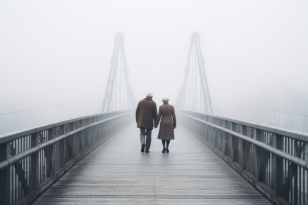 Elderly couple walking hand in hand across a foggy bridge creating a romantic atmosphere and serene moment. Generative AI.