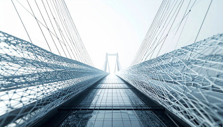 A dynamic, low-angle view looking up at the intricate steel and glass framework of a modern bridge. The converging lines create a powerful sense of perspective, symbolizing progress, innovation, and the journey towards a technologically advanced future.