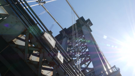 Manhattan Bridge to Brooklyn Dumbo. New York City symbol, USA travel destination. Architecture of United States, tourist landmark. Cable-stayed bridge. Cables and sky from pedestrian path. Sun rays.