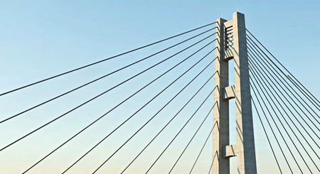 Ropes of a cable-stayed bridge against a blue sky.