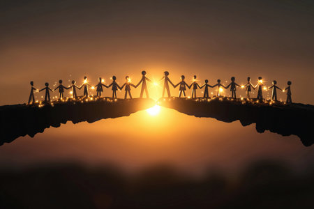 Groups of people hold hands to create a bridge at sunset, symbolizing unity and partnership.