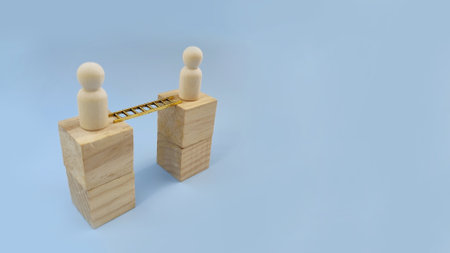 Two wooden figures connected by ladder representing teamwork, cooperation, support, leadership, and shared success concept.