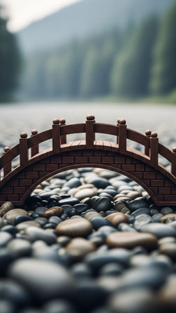 Vertical 9:16 composition focusing on a small, dark wooden decorative bridge model resting securely