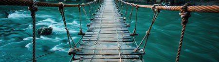 A suspension bridge made of ropes and wooden planks crosses over a serene turquoise river, inviting a daring journey toward exploration