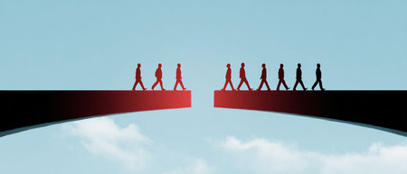 People hold hands while walking across a rope bridge in fog, representing teamwork, determination, and support in overcoming challenges in life or work.