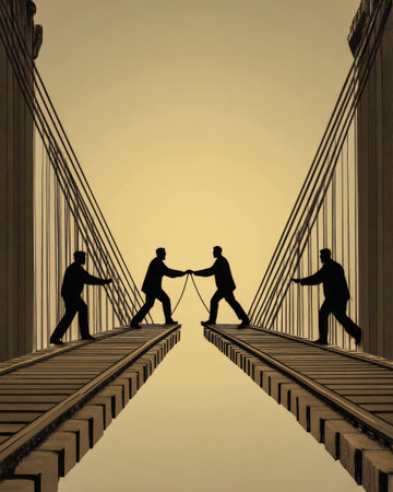 Four silhouetted figures work together on a bridge at sunset expertly pulling a rope to create a connection. The scene symbolizes teamwork and unity amid a serene backdrop.