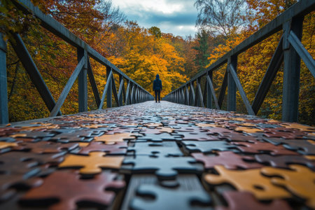 A person on a puzzle piece bridge, symbolizing the intricate journey of life and its complexities