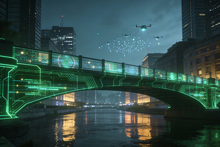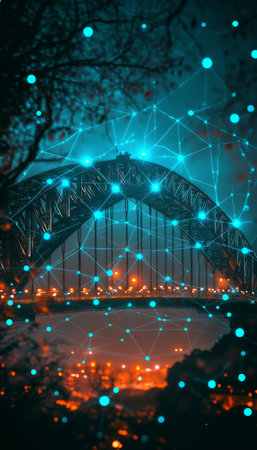 City Bridge Illuminated with Blue Lights, Connected by Digital Network, Night Cityscape