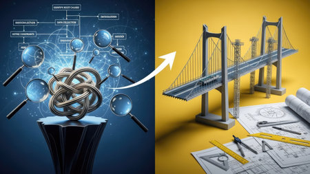 An artistic illustration depicts the process of engineering design and construction, with abstract elements merging into a bridge model. This conceptual artwork uses blue and yellow hues, creating a dynamic contrast. The composition suggests technical precision, with implied tools and diagrams, suitable for various design, engineering, or conceptual projects.