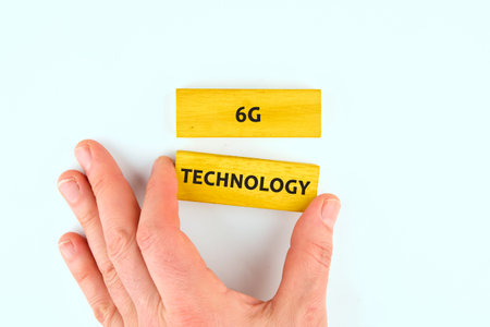 A hand reaches for two yellow blocks labeled 6G and technology, symbolizing the future of wireless communication. This setup emphasizes innovation in digital connectivity.