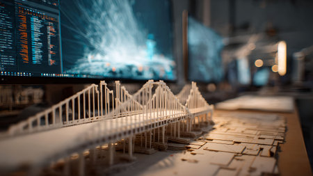 Architectural model of a bridge in a design office, showcasing planning and engineering in a modern workspace.