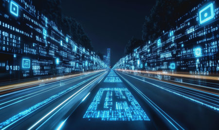 A mesmerizing digital highway with glowing blue neon lines and a grid pattern, evoking themes of technology, data flow, and future progress.