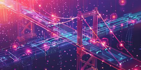 This striking digital illustration showcases a suspension bridge designed with interconnected lines and bright nodes, representing modern technology and connectivity.