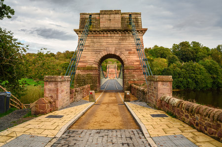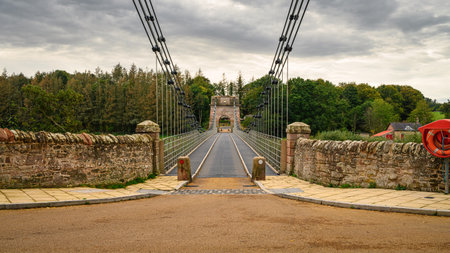 Union Chain Bridge entrance from Scotland, its a suspension road bridge that spans the River Tweed between England and Scotland located four miles upstream of Berwick Upon Tweed