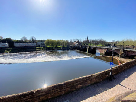 The English Bridge spanning the River Severn in Shrewsbury, Shropshire, England. With the United Reformed Church. With colour toning