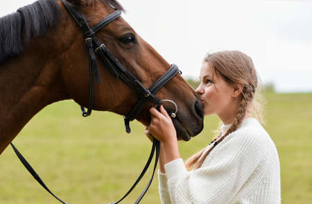 Young girl walking with a horse in nature.