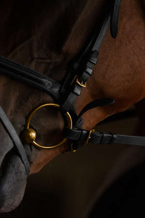 The nose of a bay horse with a white groove on the muzzle. Portrait sports stallion in the bridle. Horse muzzle close up. Dressage horse. Equestrian sport. Horse riding.