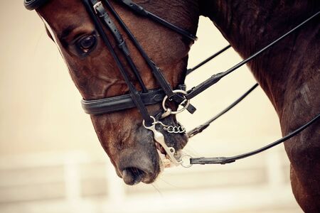 The muzzle is sports brown stallion in the bridle. Dressage horse. Equestrian sport.