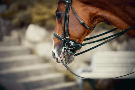 The muzzle is sports red stallion in the bridle. Dressage horse. Equestrian sport.