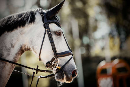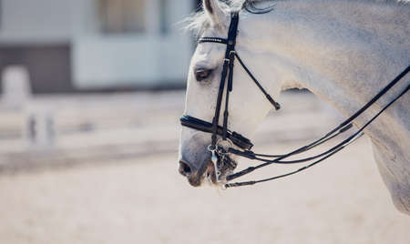 Portrait of a sports gray horse in the bridle in the arena. Horse muzzle close up. Portrait stallion in the bridle. Dressage of horses. Equestrian sport. Horseback riding.