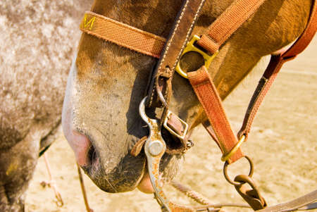 A brown horse muzzle in the harness