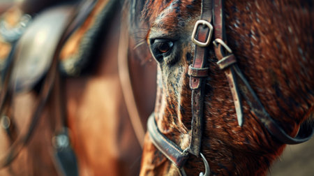 A detailed view of a horses head wearing a bridle, showcasing the intricate design and textures of the leather and metal hardware. The horses eyes, nostrils, and mouth are visible, along with the reins held in the riders hands.