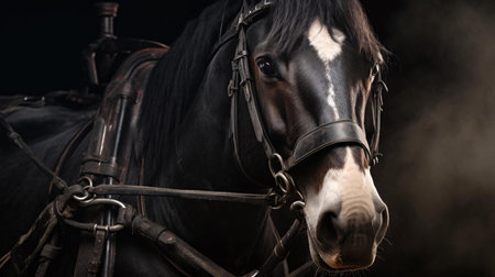 Black-and-white portrait of a beautiful black racehorse with a leather bridle on its muzzle, illuminated by sunlight.