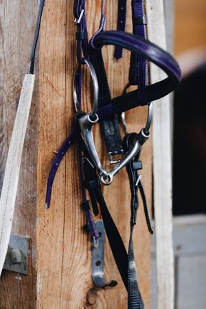 Horse-riding equipment on a wall. Close up.