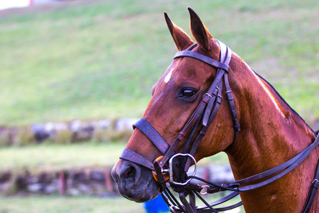 Portrait of a sports brown horse, riding on a horse