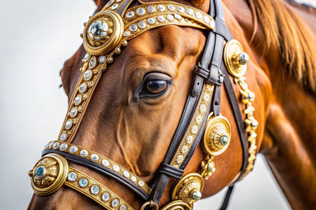 Horse portrait. Ornate headgear with jewels on a brown horse against a bright background