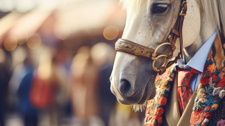 A white horse with a colorful scarf on its neck, AI