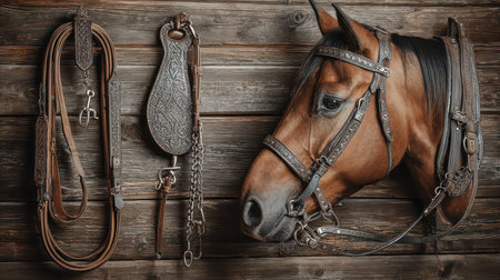A stunning close-up of a chestnut horse's head showcasing leather tack and accessories against a rustic wooden backdrop, highlighting the beauty and strength of equestrian life.