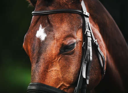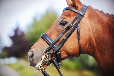 Portrait of a beautiful bay horse with a leather bridle on its muzzle on a sunny summer day. Dressage competitions. Equestrian sports. Horse riding.