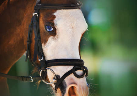 Portrait of a beautiful bay horse with bright blue eyes and a bridle on its muzzle on a sunny summer day. Equestrian sports. Equestrian life.