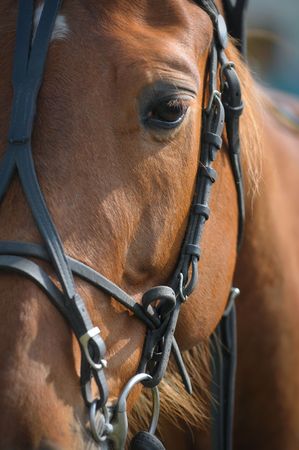 Portrait of a thoroughbred horse in a bridle. Close-up.