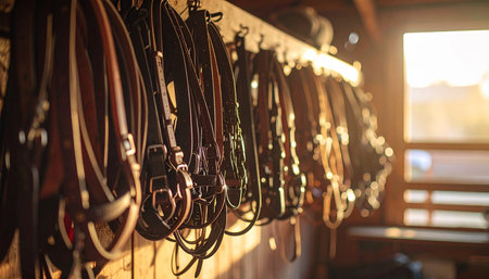 In the quiet of a rustic tack room, rows of well-worn leather bridles hang in anticipation. The warm, golden light of dawn streams through a nearby window, illuminating the space and promising a new day of riding and adventure ahead.