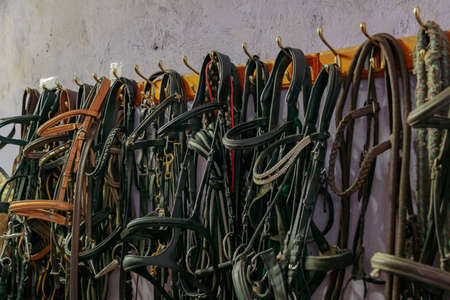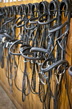 Leather horse bridles hanging neatly on a wooden rack against a neutral wall