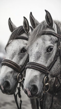 A black and white photo of a horse with a bridle on its muzzle. Equestrian sports and horse riding. Equestrian life.