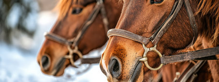 A detailed view of a horses head wearing a bridle, showcasing the intricate design and textures of the leather and metal hardware. The horses eyes, nostrils, and mouth are visible, along with the reins held in the riders hands.