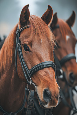 A stunning close-up of a chestnut horse's head showcasing leather tack and accessories against a rustic wooden backdrop, highlighting the beauty and strength of equestrian life.