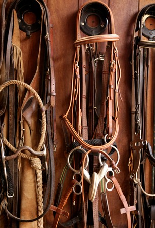 A row of leather bridles hangs neatly in a rustic wooden barn. The warm, golden light from a window in the background suggests a quiet moment of preparation before the days ride, evoking a sense of tradition and passion for the equestrian lifestyle.
