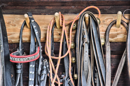 Ropes, chains, horse stable tools hanging on a fence at a horse farm.