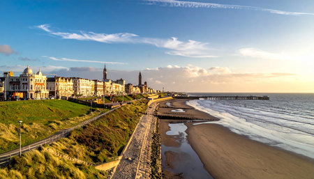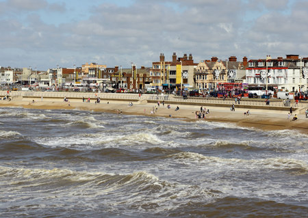 Blackpool Beach viewed from the North Pier. Sunny weather with blue sky.