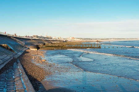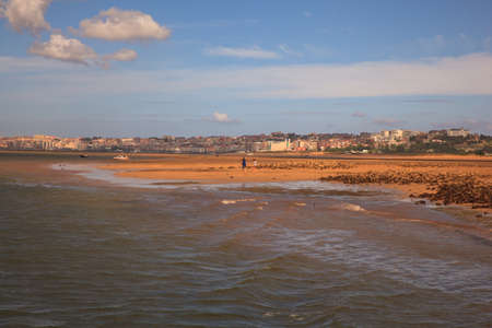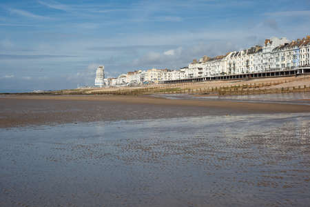 Hastings sea front in a low tide, East Sussex, England, view to the west of the pier, selective focus on the nearest sea groin