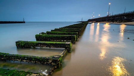 Dramatic shot of a wooden breakwater found at Hornsea Beach, East Yorkshire, UK.