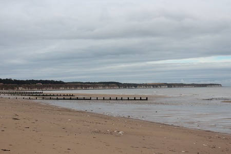 The sandy beach and shore at Bridlington, England under a cloudy sky