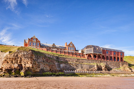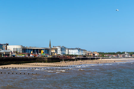 Scarborough, North Yorkshire, United Kingdom - 12 September 2022 : buildings along the seafront at scarborough south bay with the coney island amusement arcade and tourists near the beach on a sunny summer day
