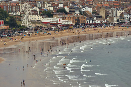 A bustling beach scene with many people, buildings, a Ferris wheel, and the ocean with waves in Scarborough, UK.