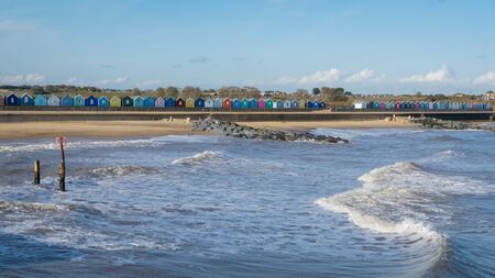 The beach at Saltburn in England showing the tide coming in and the colorful huts